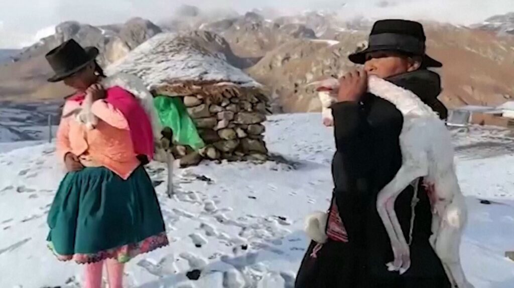 เปรู 25 พ.ย. – อัลปากาในเปรูกว่า 500 ตัว หนาวตาย หลังอุณหภูมิลดต่ำถึงจุดเยือกแข็ง ทำให้ทุ่งหญ้าที่เป็นอาหารกลายเป็นน้ำแข็ง จนพวกสัตว์กินเป็นอาหารไม่ได้
