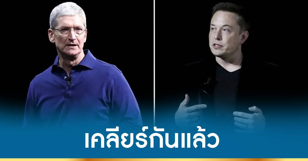 มัสก์ระบุผ่านทวิตเตอร์ว่า เขาได้พูดคุยกับคุกเพื่อปรับความเข้าใจในเรื่องเข้าใจผิดที่เขาคิดว่าแอปเปิลจะถอดแอปพลิเคชั่นทวิตเตอร์ออกจากแอปสโตร์แล้ว และคุกก็ได้ยืนยันชัดเจนว่าไม่เคยคิดที่จะทำเช่นนั้น นอกจากนี้ มัสก์ยังได้ทวีตโพสต์ที่เป็นวิดีโอคลิปที่แสดงให้เห็นภาพอาคารสำนักงานใหญ่อันสวยงามของแอปเปิล ซึ่งตั้งอยู่ที่เมืองคูเปอร์ติโนในรัฐแคลิฟอร์เนียของสหรัฐ พร้อมทั้งระบุว่า การพูดคุยระหว่างเขากับคุกเป็นไปด้วยดี