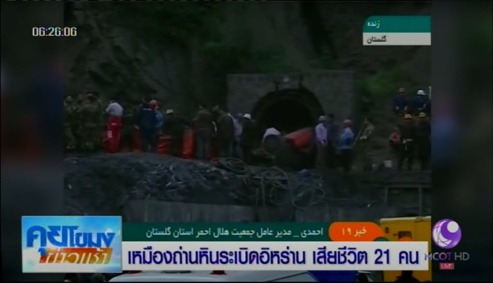 สถานีโทรทัศน์ช่องไออาร์ทีวี 1 ของรัฐบาลอิหร่าน รายงานว่า เกิดเหตุระเบิดภายในอุโมงค์เหมืองถ่านหินเซเมสตานที่เมืองโกลสตาน ทางตอนเหนือของอิหร่าน เมื่อช่วงบ่ายวานนี้ ตามเวลาท้องถิ่น ขณะมีการเปลี่ยนกะการทำงาน มีผู้เสียชีวิตแล้วอย่างน้อย 21 คน บาดเจ็บอีกกว่า 30 คน โดยมีคนงาน 16 คน หนีเอาตัวรอดออกมาได้ แต่ยังมีคนงานติดอยู่ใต้อุโมงค์ใต้ดิน ซึ่งลึกลงไปถึง 1,300 เมตร อีก 32 คน เสี่ยงที่จะเกิดอันตรายทั้งจากการก๊าซระเบิดและพื้นที่ขนาดจำกัดจนอาจขาดอากาศหายใจ