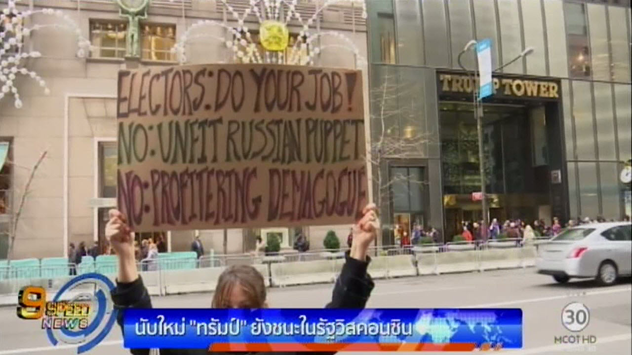 คณะกรรมการการเลือกตั้งรัฐวิสคอนซินของสหรัฐ ประกาศผลการนับคะแนนเลือกตั้งประธานาธิบดีสหรัฐใหม่ของรัฐว่า นายโดนัลด์ ทรัมป์ มีชัยเหนือนางฮิลลารี คลินตัน กว่า 22,000 คะแนน จากทั้งหมดเกือบ 3 ล้านเสียง ขณะที่กลุ่มผู้ประท้วงราว 150 คน เดินขบวนประท้วงไปยังอาคารทรัมป์ ทาวเวอร์ ในมหานครนิวยอร์ก เรียกร้องให้คณะผู้เลือกตั้งไม่ลงคะแนนให้ทรัมป์ ได้เป็นประธานาธิบดีสหรัฐ โดยการลงคะแนนเสียงจะมีในวันที่ 19 ธันวาคมนี้.-สำนักข่าวไทย