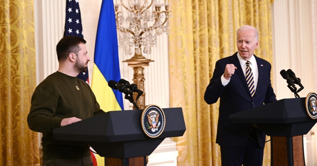 ประธานาธิบดีไบเดนกล่าวกับประธานาธิบดีเซเลนสกีในขณะที่ผู้นำยูเครนเดินเยี่ยมชมทำเนียบขาวของสหรัฐว่า ยูเครนจะไม่มีวันถูกทอดทิ้งให้โดดเดี่ยวเดียวดาย พร้อมยืนยันเรื่องที่สหรัฐจะมอบความช่วยเหลือครั้งใหม่มูลค่ากว่า 2,000 ล้านดอลลาร์สหรัฐ (ราว 69,308 ล้านบาท) ให้แก่ยูเครนเพื่อนำไปใช้ป้องกันประเทศจากการโจมตีของรัสเซีย และให้สัญญาว่าจะมอบความช่วยเหลืออีกราว 45,000 ล้านดอลลาร์สหรัฐ (ราว 1.56 ล้านล้านบาท) นอกจากนี้ ประธานาธิบดีไบเดนยังกล่าวในงานแถลงข่าวร่วมกับประธานาธิบดีเซเลนสกีว่า เขาไม่ได้รู้สึกวิตกกังวลเลยแม้แต่น้อยเกี่ยวกับการจัดตั้งกลุ่มแนวร่วมนานาชาติที่เป็นพันธมิตรร่วมกันเพื่อช่วยเหลือยูเครน ทั้งยังระบุว่า ประธานาธิบดีวลาดิเมียร์ ปูติน ของรัสเซีย ยังคงไม่มีความคิดที่จะหยุดการทำสงครามอันโหดร้ายในครั้งนี้