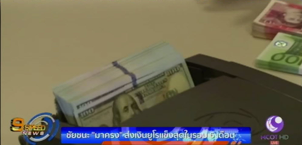 8 พ.ค. – ค่าเงินยูโรเมื่อเทียบกับเงินดอลลาร์สหรัฐ แข็งค่าขึ้นแตะที่ระดับ 1.1023 ดอลลาร์สหรัฐ/ยูโร สูงสุดในรอบ 6 เดือน หรือนับตั้งแต่เดือนพฤศจิกายนที่ผ่านมา ซึ่งเป็นผลมาจากชัยชนะของนายเอ็มมานูเอล มาครง นักการเมืองสายกลาง ที่คว้าชัยชนะการเลือกตั้งประธานาธิบดีฝรั่งเศส ส่งผลให้นักลงทุนคลายความกังวลเกี่ยวกับอนาคตของฝรั่งเศสที่จะแยกตัวออกจากกลุ่มยูโรโซน หรือกลุ่มประเทศที่ใช้สกุลเงินยูโร. – สำนักข่าวไทย