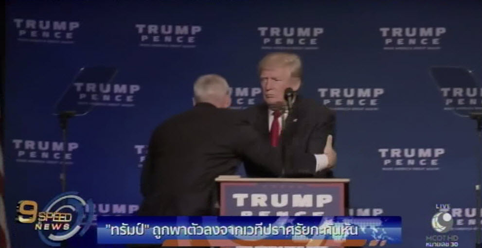 นายโดนัลด์ ทรัมป์ ตัวแทนพรรครีพับลิกันชิงตำแหน่งประธานาธิบดีสหรัฐ ถูกเจ้าหน้าที่รักษาความปลอดภัยเข้าคุ้มกันและพาตัวลงจากเวที ขณะปราศรัยหาเสียงที่เวทีปราศรัยเมืองรีโน รัฐเนวาดา เมื่อวานนี้ รายงานแจ้งว่า ขณะที่นายทรัมป์ถูกเจ้าหน้าที่รักษาความปลอดภัยกันตัวลงจากเวทีนั้น ได้เกิดเหตุชุลมุนเล็กน้อย และมีผู้ต้องสงสัยถูกพาตัวออกไป 1 คน หลังจากนั้นนายทรัมป์ก็กลับขึ้นกล่าวปราศรัยต่อ