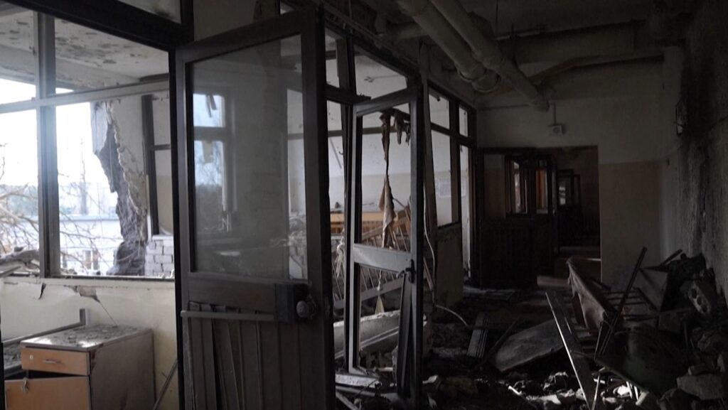 ส่วนภาพนี้เป็นภาพความเสียหายของโรงพยาบาลเด็กแห่งหนี่ง ในเมืองเคอร์ซอน ซึ่งตั้งอยู่ทางใต้ของประเทศและถูกโจมตีในช่วงเวลาเดียวกัน แรงระเบิดทำให้ไฟลุกไหม้สร้างความเสียหายอย่างหนัก