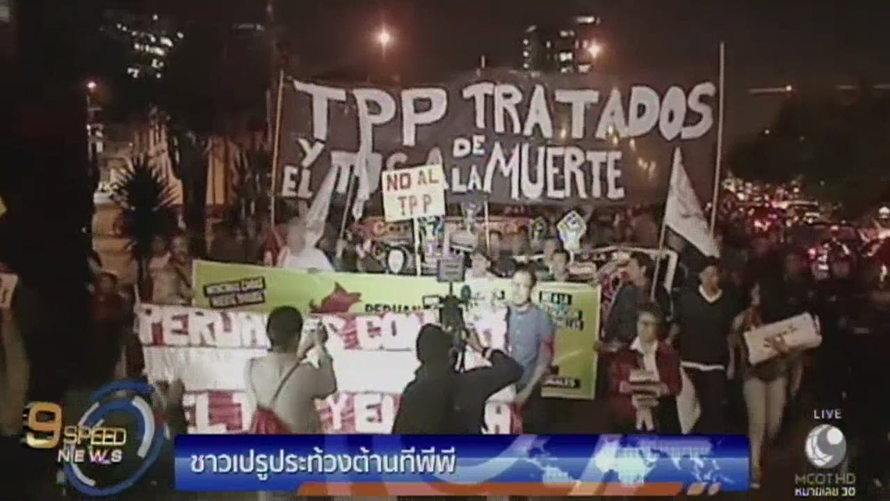 เปรู 5 พ.ย.-ชาวเปรูหลายร้อยคนเคลื่อนขบวนไปตามถนนในกรุงลิมา เพื่อประท้วงต่อต้านการทำข้อตกลงความเป็นหุ้นส่วนเศรษฐกิจ เอเชีย-แปซิฟิก หรือทีพีพี เพราะเห็นว่าข้อตกลงดังกล่าว จะส่งผลเสียอย่างรุนแรงต่อธุรกิจในประเทศ ที่จะไม่สามารถแข่งขันได้กับบริษัทของต่างประเทศ ผู้ประท้วงเรียกร้องให้รัฐสภางดการให้สัตยาบันรับรองข้อตกลงนี้หลังจากที่รัฐบาลเปรู ในสมัยอดีตประธานาธิบดีโอยันตา อูมาล่าเป็นผู้สมัครเข้าร่วมกลุ่มทีพีพี .-สำนักข่าวไทย