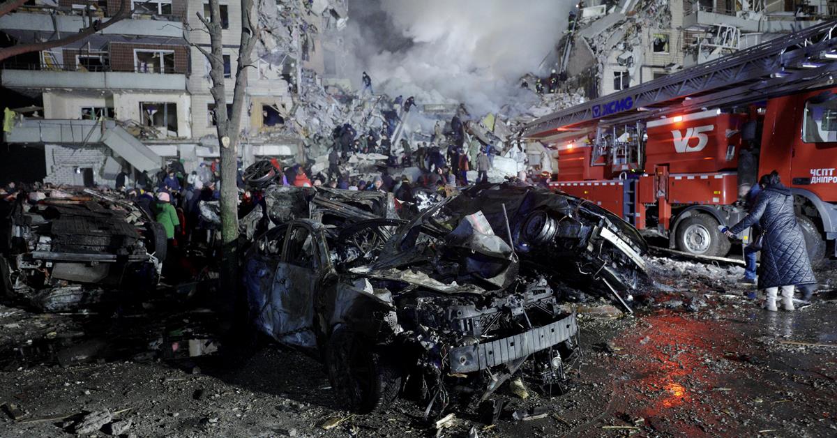 เจ้าหน้าที่ยูเครนประณามรัสเซียที่ยิงขีปนาวุธถล่มทั่วประเทศเมื่อวานนี้ ทั้งที่เป็นวันขึ้นปีใหม่ของคริสตศาสนาจักรออร์โธด็อกซ์ ผู้ว่าการแคว้นดนีโปรเปตรอฟสก์เผยว่า มีคนเสียชีวิตอย่างน้อย 14 คน บาดเจ็บ 64 คน จากการที่อพาร์ตเมนต์แห่งหนึ่งในเมืองดนีโปรถูกยิงถล่ม เจ้าหน้าที่กู้ภัยยังคงค้นหาผู้เคราะห์ร้ายที่อยู่ใต้ซากอาคาร การโจมตีดังกล่าวทำให้คน 100-200 คนไร้บ้าน และอีก 1,700 คนไม่มีไฟฟ้าใช้
