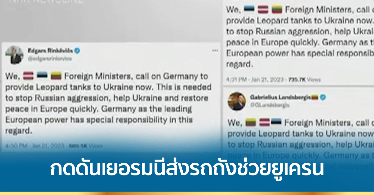 เยอรมนี 22 ม.ค. – กลุ่มประเทศแถบทะเลบอลติกร่วมกันเรียกร้องให้เยอรมนีจัดส่งรถถังรุ่นเลพเพิด 2 ให้ยูเครนโดยทันที เพื่อหยุดยั้งปฏิบัติการทางทหารของรัสเซีย