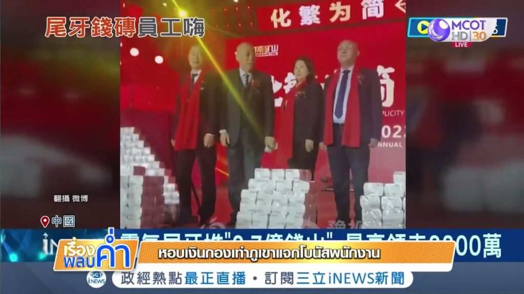 จีน 31 ม.ค.- เห็นแล้วอิจฉา บริษัทแห่งหนึ่งในจีนหอบเงินสดๆ 61 ล้านหยวน หรือเกือบ 300 ล้านบาท เอามากองเป็นภูเขา เพื่อจ่ายโบนัสให้พนักงานในช่วงสิ้นปีที่ผ่านมา