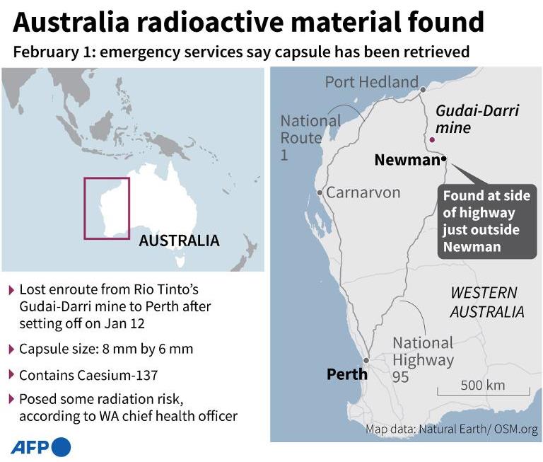 ขณะที่นายดาร์เรน เคลมม์ กรรมาธิการเหตุฉุกเฉินประจำรัฐเผยว่า เจ้าหน้าที่ตระเวนหาแคปซูลดังกล่าวบนทางหลวงเป็นระยะทางหลายร้อยกิโลเมตร ใช้เวลาค้นหาทั้งหมด 6 วัน จนกระทั่งรถค้นหาตรวจพบรังสีและพบแคปซูลตกอยู่ริมทางใกล้กับเหมืองที่รถบรรทุกเข้าไปรับแคปซูล จึงได้ย้ายแคปซูลไปยังที่ปลอดภัยแล้ว แคปซูลนี้มีขนาดเล็กกว่าเล็บมือ โดยมีขนาดเล็กเพียง 8×6 มิลลิเมตร แต่บรรจุซีเซียม-137 ซึ่งเป็นกัมมันตรังสีที่อันตรายต่อร่างกายได้อย่างเฉียบพลัน.-สำนักข่าวไทย
