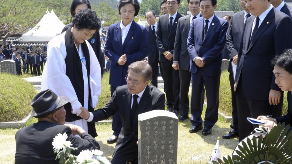 ประธานาธิบดีมุนปาดน้ำตาขณะร่วมพิธีที่สุสานเมืองกวางจู ทางใต้ของประเทศ มีการถ่ายทอดสดทางโทรทัศน์และมีผู้เข้าร่วมกว่าหมื่นคน เป็นพิธีรำลึกถึงผู้เสียชีวิต 165 คน หายสาบสูญกว่า 70 คนจากเหตุสังหารหมู่ระหว่างวันที่ 18-27 พฤษภาคม 2523 กวาดล้างชาวเมืองกวางจูที่ชุมนุมต่อต้านนายพลชุนซึ่งยึดอำนาจหลังจากประธานาธิบดีปัก จุงฮี ถูกหัวหน้าหน่วยข่าวกรองลอบสังหารเมื่อเดือนตุลาคม 2519 ประธานาธิบดีมุนกล่าวว่า รัฐบาลของเขาถือกำเนิดขึ้นจากเหตุเรียกร้องประชาธิปไตยเมืองกวางจู เพราะก่อนหน้านั้นเคยถูกจับกุมในฐานะแกนนำนักศึกษาประท้วงการปกครองแบบเผด็จการของประธานาธิบดีปัก