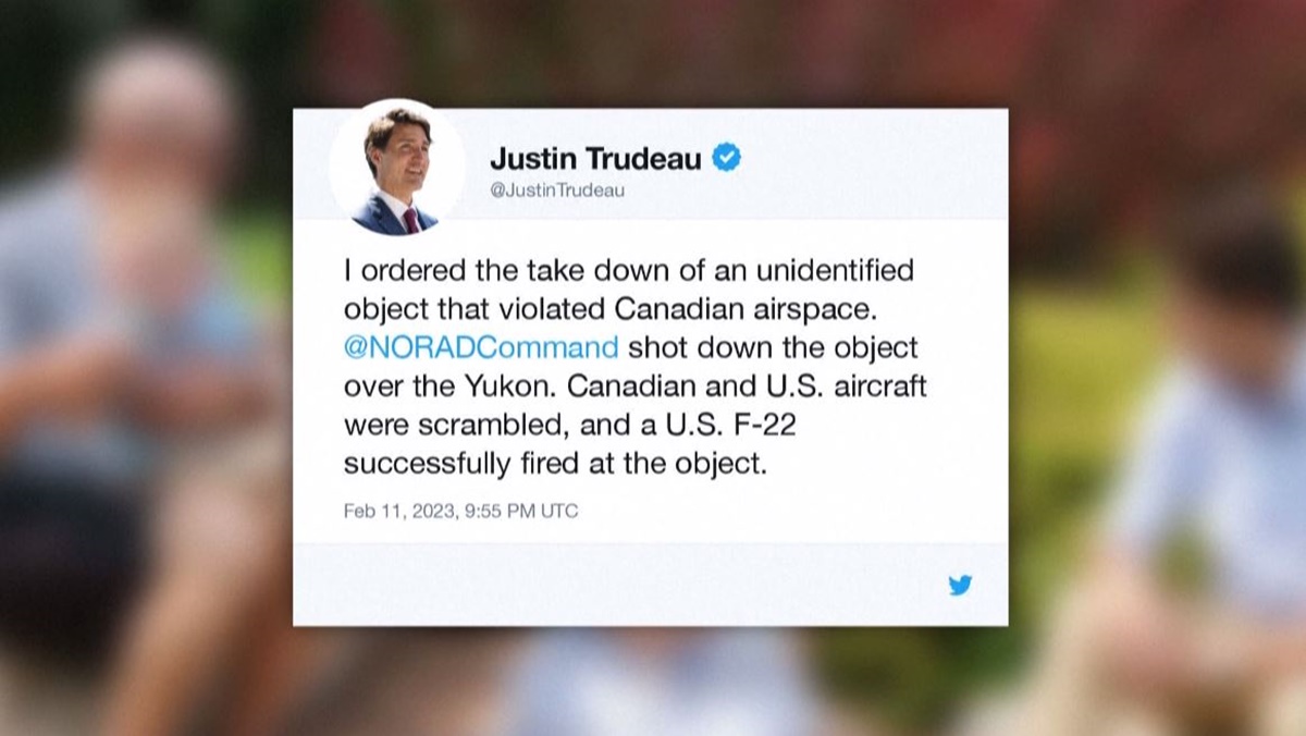นายกรัฐมนตรีจัสติน ทรูโด ของแคนาดา แถลงยืนยันว่า วัตถุลอยฟ้ารุกล้ำน่านฟ้าของแคนาดา ถูกยิงตกโดยเครื่องบินรบ รุ่นเอฟ-22 ของสหรัฐ เหนือภูมิภาคยูคอน ทางภาคตะวันตกเฉียงเหนือ ซึ่งกองทัพแคนาดาจะดำเนินการค้นหาและเก็บกู้ซากวัตถุลอยฟ้าที่ถูกยิง เพื่อตรวจสอบรายละเอียดต่อไป. – สำนักข่าวไทย
