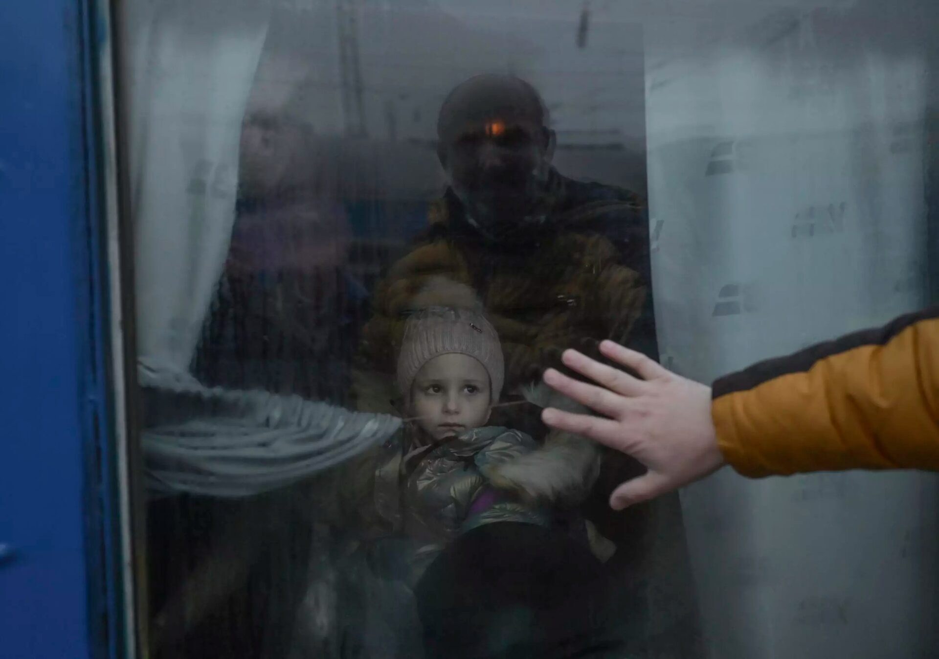 ผู้คนเริ่มหลั่งไหลเดินทางออกนอกยูเครน ทั้งทางรถยนต์ รถโดยสาร รถไฟ หรือแม้แต่เดินเท้า ผู้ชายในวัยที่สู้รบได้ได้รับคำสั่งให้อยู่ปกป้องประเทศและต้องร่ำลาคนในครอบครัว ดังภาพนี้ที่บิดาคนหนึ่งใช้มือแตะกระจกร่ำลาบุตรสาวที่นั่งอยู่บนรถไฟในเมืองโอเดสซา ทางตะวันตกเฉียงใต้ของยูเครน