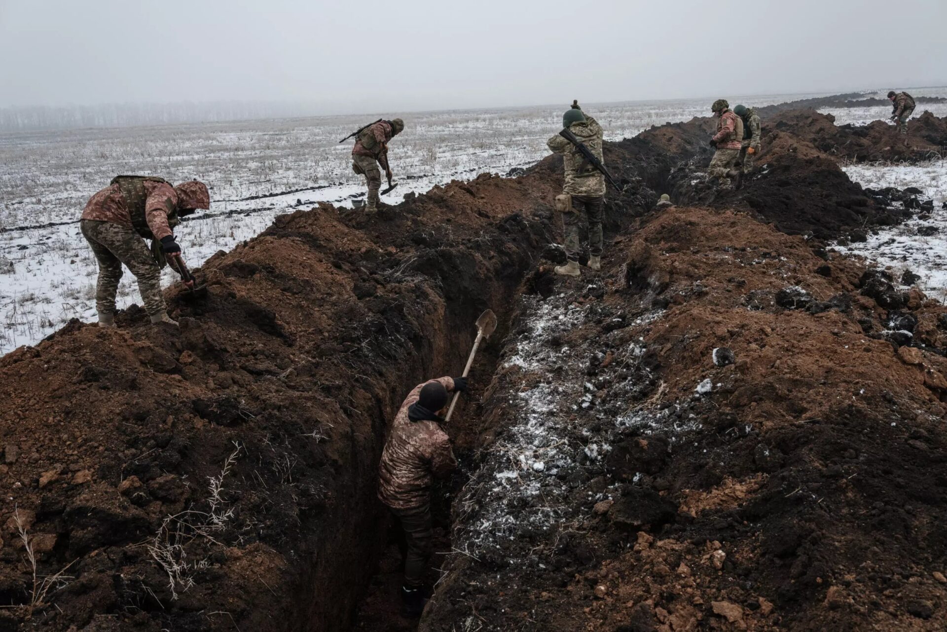 การสู้รบในยูเครนที่ดำเนินมาร่วมปีได้หวนกลับไปสู่การทำสงครามสนามเพลาะในสมัยสงครามโลกครั้งที่ 2 ทหารทั้ง 2 ฝ่ายต้องต่อสู้กันท่ามกลางภาพอากาศหนาวเหน็บในช่วงฤดูหนาว สนามเพลาะในภาพนี้อยู่ใกล้เมืองบัคห์มุต ทางตะวันออกของยูเครน.-สำนักข่าวไทย