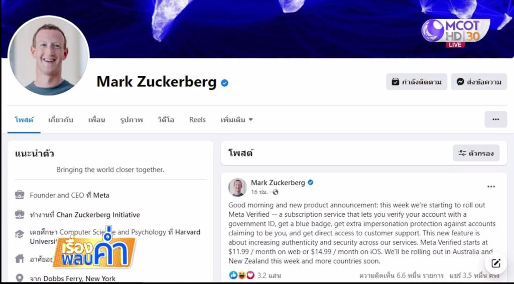 เว็บไซต์สถานีโทรทัศน์ France24 ของฝรั่งเศส เสนอข่าวอ้างการเปิดเผยของมาร์ค ซัคเคอร์เบิร์ก ซีอีโอของเมตา บริษัทผู้ให้บริการสื่อสังคมออนไลน์อย่างเฟซบุ๊ก ที่ระบุว่าเฟซบุ๊กจะเก็บค่าบริการยืนยันตัวตนบัญชี เป็นเงิน 11.99 ดอลลาร์สหรัฐ หรือราว 420 บาท/เดือน จะเริ่มใช้ในออสเตรเลียและนิวซีแลนด์ภายในสัปดาห์นี้ โดยระบบนี้จะให้ผู้ใช้ยืนยันบัญชีของตนเองด้วยเอกสารยืนยันตัวตนที่รัฐบาลออกให้ และได้รับป้ายสีน้ำเงิน พร้อมได้รับการป้องกันการแอบอ้างเพิ่มเติม รวมถึงสนับสนุนการเข้าถึงลูกค้าได้โดยตรง คุณลักษณะใหม่นี้เกี่ยวกับการเพิ่มความถูกต้องและความปลอดภัยในบริการของเฟซบุ๊ก อย่างไรก็ตาม จะไม่มีการเปลี่ยนแปลงบัญชีบนเฟซบุ๊กและอินสตาแกรมที่ได้รับการยืนยันแล้ว และเฉพาะผู้ใช้ที่อายุเกิน 18 ปีเท่านั้นที่จะได้รับอนุญาตให้สมัครสมาชิก อนึ่ง บริการนี้ยังไม่พร้อมให้บริการสำหรับธุรกิจ