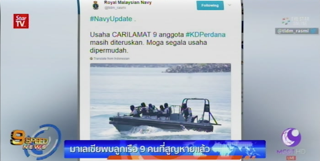 เจ้าหน้าที่ค้นหาของมาเลเซียพบเรือเล็กของเรือรบลำหนึ่งที่หายไปพร้อมกับลูกเรือ 9 นายระหว่างลาดตระเวนนอกชายฝั่งรัฐยะโฮร์ ทางใต้ของประเทศตั้งแต่วันเสาร์แล้ว โดยอยู่ห่างจากชายฝั่งเมืองกวนตัน เมืองเอกของรัฐปะหังราว 90 ไมล์ทะเล และทั้งหมดปลอดภัยดี