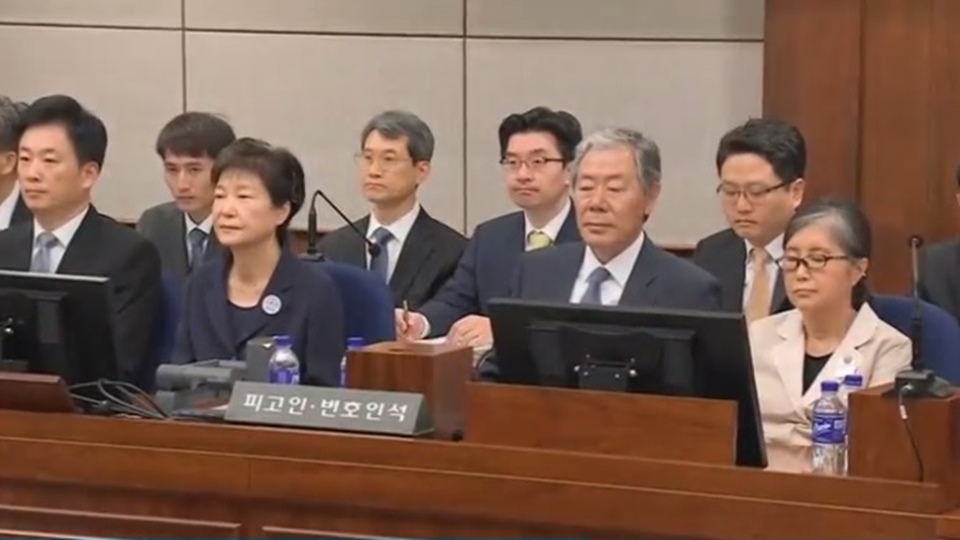 ปักวัย 65 ปี เดินทางมาศาลด้วยรถตู้ของเรือนจำ สวมชุดสูทสีดำติดหมายเลขผู้ต้องขัง 503 และถูกสวมกุญแจมือ เธอถูกตั้งข้อหาทั้งหมด 18 กระทง มีทั้งรับสินบน ใช้อำนาจโดยมิชอบ ข่มขู่ และเผยแพร่ข้อมูลลับของรัฐ เธอยืนกรานว่าถูกใส่ร้าย และไม่ได้กระทำความผิดใด ๆ หากถูกตัดสินว่ามีความผิดในข้อหารับสินบนจากภาคธุรกิจจะถูกจำคุกไม่ต่ำกว่า 10 ปี และสูงสุดตลอดชีวิต ศาลเปิดการไต่สวนเมื่อเวลา 06.00 น.วันนี้ตามเวลาท้องถิ่น ตรงกับเวลา 08.00 น.วันนี้ตามเวลาในไทย ทนายความนั่งกั้นกลางระหว่างเธอกับนางชเว ซุนซิล เพื่อนสนิทที่ถูกกล่าวหาว่าใช้ความสัมพันธ์กับเธอกดดันภาคธุรกิจให้บริจาคเงินเข้ามูลนิธิแล้วนำไปใช้ส่วนตัว ทั้งคู่ไม่ได้ทักทายหรือแม้แต่สบตากัน