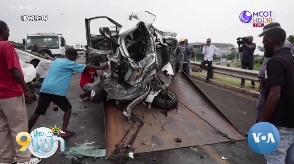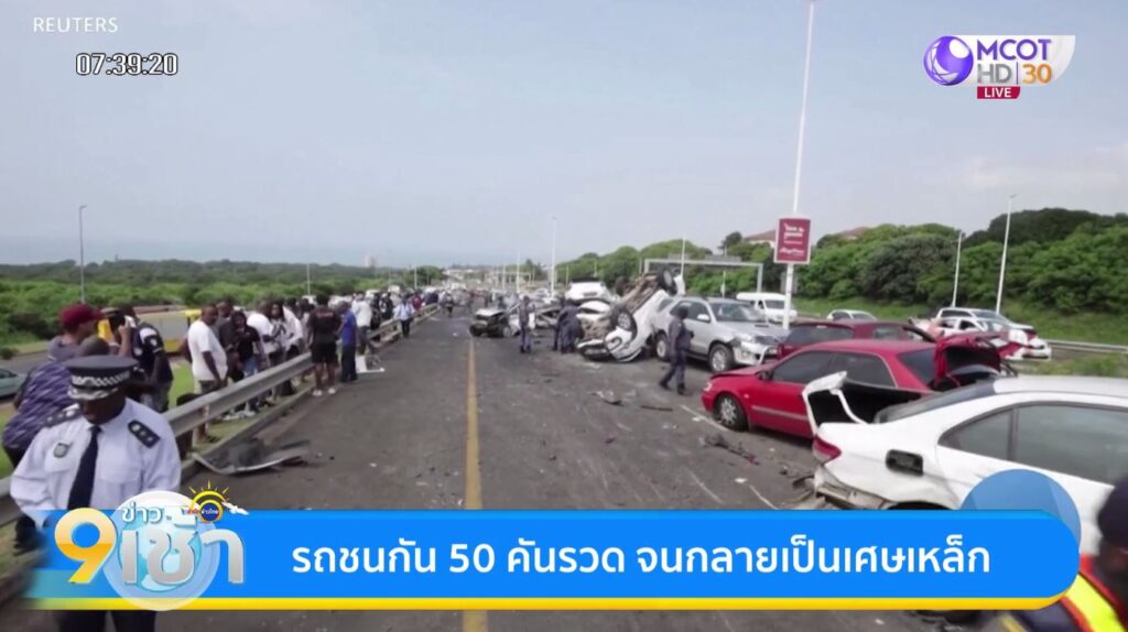 สภาพของรถยนต์จำนวนเกือบ 50 คัน ที่ชนกันยับกลายเป็นเศษเหล็กเกลื่อนถนนมอเตอร์เวย์ใกล้เมืองอัมลังกา จังหวัดควาซูลู-นาทาลของแอฟริกาใต้ หลังจากรถบรรทุกคันหนึ่งเกิดเบรกแตกพุ่งชนท้ายขบวนรถยนต์ที่แล่นอยู่ด้านหน้าในช่วงชั่วโมงเร่งด่วน ตอนเช้าวันจันทร์ที่ผ่านมา ทำให้รถที่ขับตามหลังมาติดๆ กันอีกหลายสิบคันเบรกไม่อยู่พุ่งชนท้ายกันเป็นทอดๆ กลายเป็นอุบัติเหตุรถชนซ้ำซ้อนเป็นระยะทางหลายสิบเมตร แต่เหลือเชื่อมากที่ไม่มีผู้เสียชีวิตจากเหตุการณ์ครั้งนี้ มีเพียงผู้ได้รับบาดเจ็บเล็กน้อยไม่กี่ราย ขณะที่ผู้ขับขี่หลายคนติดอยู่ในรถที่ถูกชนจนกองรวมกัน ต้องอาศัยเจ้าหน้าที่กู้ภัยและพลเมืองดีช่วยกันทุบกระจกนำตัวออกจากซากรถ