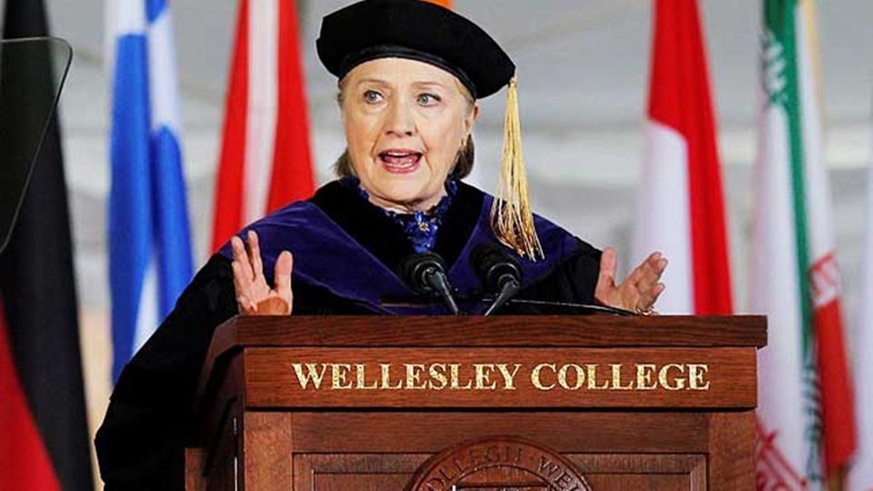 นางคลินตันวัย 69 ปี กล่าวสุนทรพจน์ที่วิทยาลัยเวลส์ลีย์ รัฐแมสซาชูเซตส์ ซึ่งเป็นวิทยาลัยสตรีที่เธอสำเร็จการศึกษาเมื่อ 48 ปีก่อนว่า อนาคตของสหรัฐฝากไว้กับผู้มีความคิดและความกล้าหาญที่จะยึดมั่นในความจริงและความซื่อสัตย์ สมัยที่เธอเรียนอยู่ ทุกคนล้วนไม่ชอบริชาร์ด นิกสัน ประธานาธิบดีในขณะนั้นที่ได้รับการเลือกตั้งเป็นสมัยที่ 2 และต้องลงจากตำแหน่งอย่างอัปยศเพราะถูกถอดถอนจากเรื่องขัดขวางกระบวนการยุติธรรม ส่วนในเวลานี้ทุกคนสำเร็จการศึกษาในช่วงที่ความจริงและเหตุผลถูกโจมตีอย่างจัง คนไม่ยอมรับวิทยาศาสตร์ วางแผนทฤษฎีสมคบคิด ปลุกเร้าความกลัวในเรื่องที่ไม่หลักฐานอย่างคนเข้าเมือง ชาวมุสลิม ชนกลุ่มน้อย และคนยากจน บางคนปฏิเสธแม้แต่สิ่งที่เห็นต่อหน้าต่อตา แล้วก็แก้ตัวด้วยการไปยกข้อเท็จจริงอื่นที่ไม่มีคนอ้างถึง หากผู้นำโกหกเรื่องปัญหาที่เราเผชิญอยู่ เราก็จะไม่มีทางแก้ปัญหาได้ ในช่วงหลายปีนี้อาจจะมีคนป่าวประกาศทั้งทางออนไลน์และด้วยตัวเองว่า คนในสังคมไม่ควรค่าที่จะพูดหรือทำอะไร หรืออาจถึงขั้นเรียกผู้หญิงว่าเป็นคนน่ารังเกียจ ก็ขอให้อย่าเพิกเฉยและเข้าไปมีส่วนร่วมทั้งทางการเมืองและทางสังคมอย่างแข็งขันต่อไป