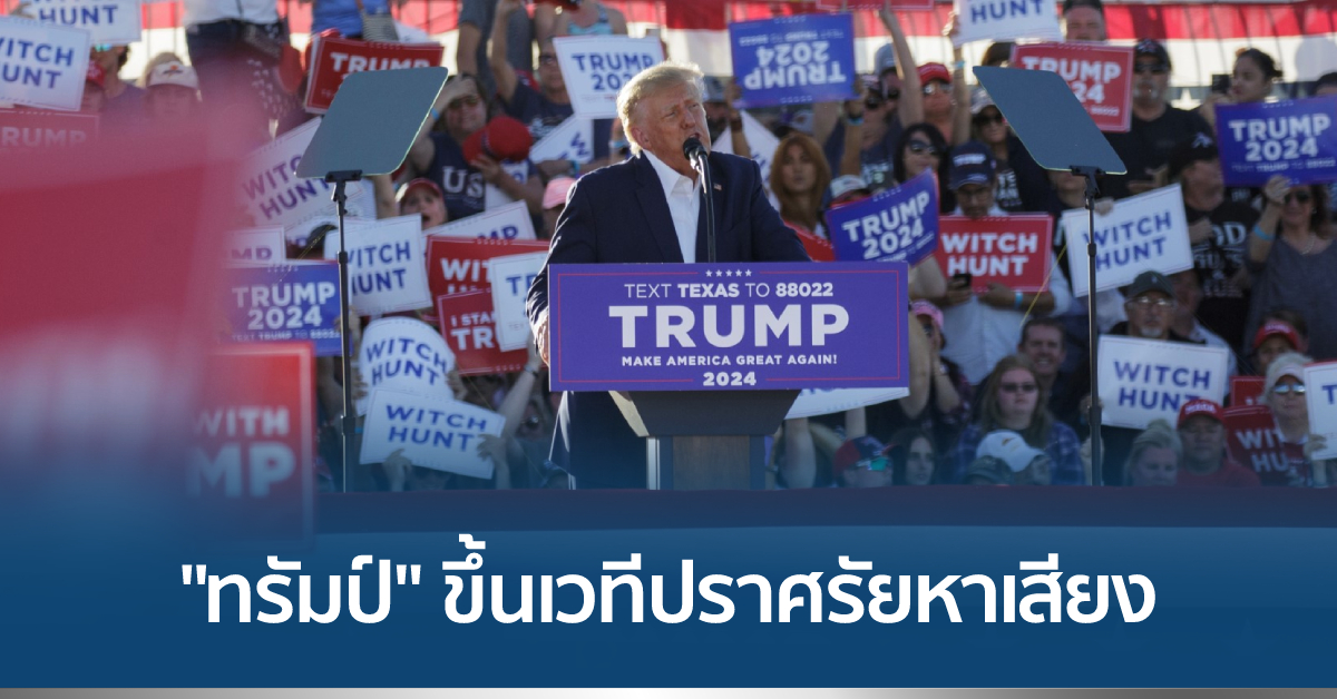 อดีตประธานาธิบดีโดนัลด์ ทรัมป์ วัย 76 ปี ขึ้นเวทีปราศรัยหาเสียงเป็นครั้งแรก เพื่อลงสมัครเป็นผู้แทนพรรครีพับลิกัน ชิงประธานาธิบดีสหรัฐ ในปีหน้า ที่เมืองวาโก รัฐเท็กซัส เมื่อวันเสาร์ พร้อมกล่าวปฏิเสธทุกข้อกล่าวหา โดยเฉพาะข้อกล่าวหาจ่ายเงินปิดปากให้อดีตดาราหนังผู้ใหญ่ เพื่อไม่ให้เปิดเผยสัมพันธ์ฉาวทางเพศที่สำนักอัยการเขตแมนฮัตตันกำลังสอบสวน นายทรัมป์ยืนยันเรื่องที่ถูกสอบสวนไม่ใช่คดีอาญาหรือการกระทำผิด แต่เขาตกเป็นเหยื่อของการล่าแม่มด.-สำนักข่าวไทย