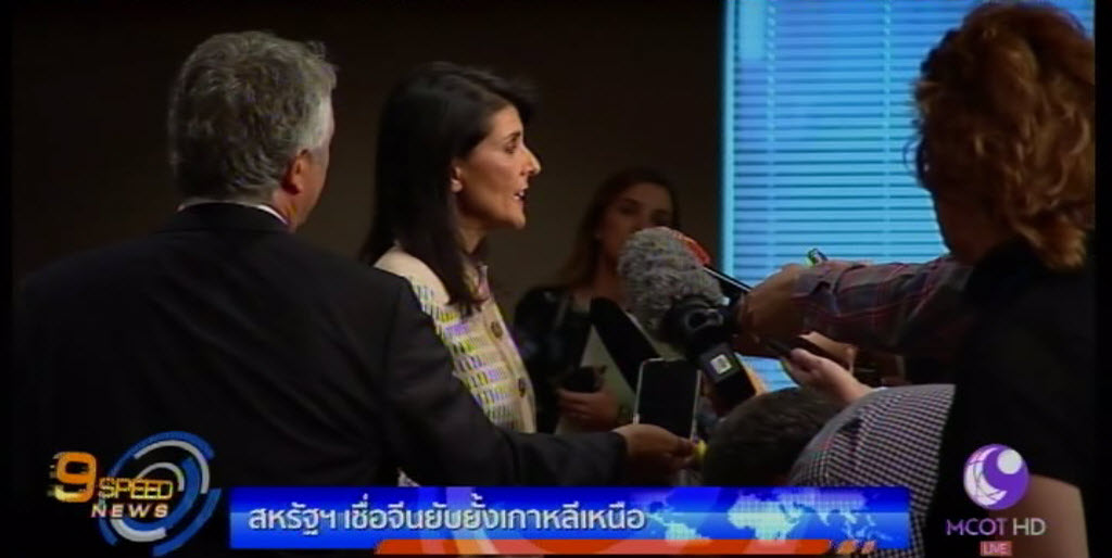 นางนิกกี้ เฮลีย์ ทูตสหรัฐประจำสหประชาชาติ หรือยูเอ็น ระบุสหรัฐเชื่อว่าจีนกำลังใช้วิธีการที่ไม่เปิดเผยในการกดดันให้เกาหลีเหนือยุติการทดลองขีปนาวุธและอาวุธนิวเคลียร์ ซึ่งจีนรู้จักเกาหลีเหนือดีที่สุด ดังนั้น สหรัฐจะกดดันจีนในเรื่องนี้ต่อไป แต่ก็จะร่วมมือกับจีนแก้ไขปัญหาเกาหลีเหนือควบคู่ไปด้วย ขณะเดียวกัน จีนและสหรัฐกำลังหารือกันเกี่ยวกับมาตรการคว่ำบาตรรอบใหม่ของยูเอ็น ก่อนหน้านี้ ทูตจีนประจำยูเอ็นเคยกล่าวว่า ภารกิจสำคัญของจีนก็คือการฟื้นเจรจากับเกาหลีเหนือ.-สำนักข่าวไทย