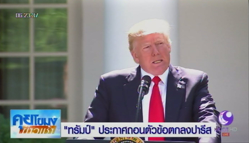 ประธานาธิบดีทรัมป์ แถลงที่ทำเนียบขาววานนี้ว่า สหรัฐจะยุติการดำเนินการตามข้อตกลงปารีส ที่ 195 ชาติลงนามให้ความเห็นชอบ ผู้นำสหรัฐกล่าวว่า เขาไม่สามารถสนับสนุนข้อตกลงที่เป็นเหมือนการลงโทษสหรัฐได้อีกต่อไป เขากล่าวด้วยว่า ข้อตกลงปารีสเป็นภาระทางการเงินและเศรษฐกิจของสหรัฐ นายทรัมป์กล่าวว่า ข้อตกลงปารีสเป็นการยอมจำนนและเป็นข้อตกลงที่จะไม่เป็นไปในแนวทางนโยบาย “อเมริกาต้องมาก่อน” ของเขา นายทรัมป์ไม่ได้ระบุรายละเอียดว่า สหรัฐจะถอนตัวอย่างไร หรือเมื่อไหร่ที่การถอนตัวอย่างเป็นทางการจะเกิดขึ้น แต่ในขณะเดียวกันเขาก็กล่าวในเชิงว่า น่าจะมีการเจรจาข้อตกลงเรื่องโลกร้อนใหม่ เขากล่าวว่า สหรัฐกำลังจะถอนตัวแต่จะเริ่มการเจรจา และจะดูว่า จะทำให้ข้อตกลงมีความเป็นธรรมกับสหรัฐได้หรือไม่ ถ้าทำได้ก็ดีมาก แต่ถ้าทำไม่ได้ก็ไม่เป็นไร