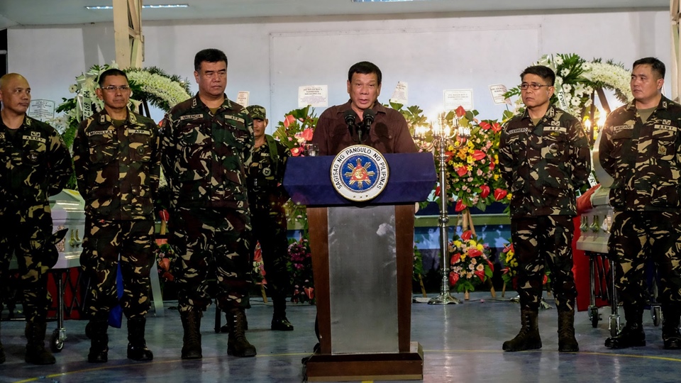 ประธานาธิบดีดูเตอร์เตประกาศกฎอัยการศึกเมื่อวันที่ 23 พฤษภาคม ไม่กี่ชั่วโมงหลังจากกลุ่มติดอาวุธภักดีต่อกลุ่มรัฐอิสลาม (ไอเอส) เข้ายึดเมืองมาราวี บนเกาะมินดาเนา การปะทะกันที่ยังคงดำเนินจนถึงขณะนี้ทำให้มีผู้เสียชีวิตแล้วไม่ต่ำกว่า 178 คน ผู้นำฟิลิปปินส์กล่าวหลังจากนั้น 5 วันว่า ไม่สนใจเรื่องที่ศาลฎีกามีอำนาจทบทวนมูลความของการประกาศกฎอัยการศึกตามที่ระบุไว้ในรัฐธรรมนูญปี 2530 หลังการโค่นล้มมาร์กอส เขาจะฟังเฉพาะทหารและตำรวจเท่านั้น อนึ่ง รัฐธรรมนูญฟิลิปปินส์อนุญาตให้ใช้กฎอัยการศึกเมื่อประเทศถูกรุกรานหรือเกิดการก่อกบฏเท่านั้น.- สำนักข่าวไทย