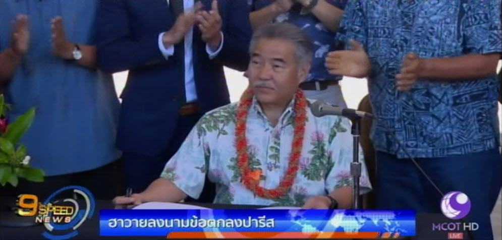 รัฐฮาวายของสหรัฐผ่านกฎหมายเพื่อกำหนดยุทธศาสตร์ในการลดก๊าซเรือนกระจก โดยมีนายเดวิด อิเก ผู้ว่าการรัฐฮาวาย เป็นผู้ลงนาม ถือเป็นการสนับสนุนข้อตกลงปารีส หลังจากที่ประธานาธิบดีโดนัลด์ ทรัมป์ ประกาศไปเมื่อสัปดาห์ที่แล้วว่า จะนำสหรัฐถอนตัวจากข้อตกลงดังกล่าว นายอิเก กล่าวว่า ฮาวายเป็นรัฐแรกที่ออกกฎหมายเพื่อดำเนินการตามข้อตกลงปารีส เนื่องจากเล็งเห็นผลกระทบที่จะเกิดจากปัญหาโลกร้อนได้เป็นอย่างดี โดยเฉพาะปัญหาคลื่นสูง การกัดเซาะชายฝั่ง ความหลากหลายทางชีวภาพที่ลดลงและปะการังฟอกขาว.-สำนักข่าวไทย