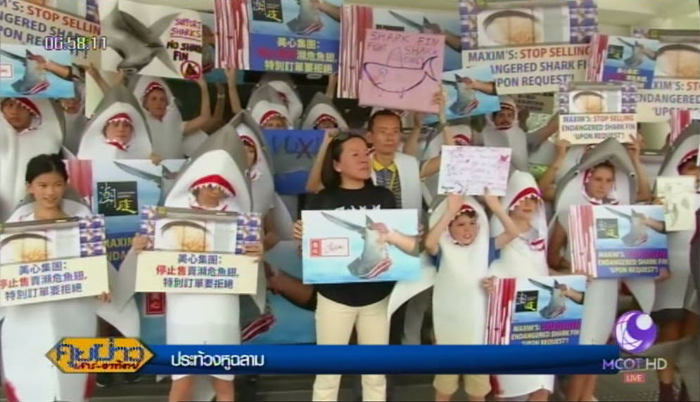 ผู้ชุมนุมประท้วงจำนวนมากสวมชุดฉลามถูกตัดครีบแล้วไปชุมนุมกันรอบร้านอาหารแมกซิม พาเลซ บริเวณอ่าวฮ่องกง พร้อมตะโกนคำว่า “หยุดขายหูฉลามได้แล้ว” บางส่วนยังถือป้ายประกาศขอให้ร้านแมกซิม พาเลซ ยุติการขายซุปหูฉลามที่ทำจากครีบฉลาม โดยเฉพาะอย่างยิ่งได้มาจากฉลามวาฬสัตว์ใกล้สูญพันธุ์ โดยร้านอาหารแห่งนี้เป็นที่นิยมของลูกค้าเข้าไปรับประทานอาหารประเภทติ่มซำจำนวนมาก