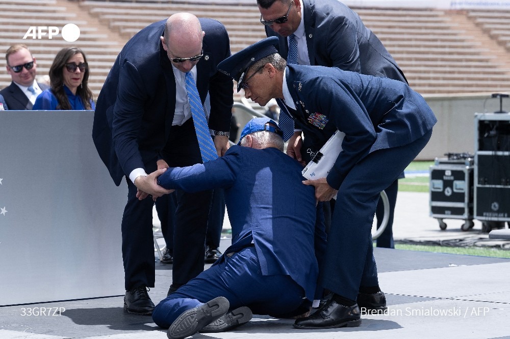 นายไบเดน วัย 80 ปี ซึ่งเสร็จสิ้นการกล่าวปราศรัยในเนื่องในวาระวันจบการศึกษาของนักเรียนนายเรืออากาศ จากนั้นเขาจับมือทักทายกับนักเรียนนายเรืออากาศคนหนึ่งและเริ่มเดินกลับไปนั่งในที่นั่งที่จัดไว้และเกิดสะดุดหกล้ม ทหารอากาศได้เข้าช่วยพยุงเขาและเขาดูเหมือนไม่ต้องการความช่วยเหลือใด ๆ เพี่มเติม ในระหว่างที่เขาลุกขึ้นยืน นายไบเดนได้ชี้นิ้วไปที่วัตถุอย่างหนึ่งที่เป็นสิ่งกีดขวางทำให้เขาเดินสะดุด ซึ่งปรากฎว่าน่าจะเป็นถุงทรายเล็ก ๆ ที่วางอยู่บนเวที
