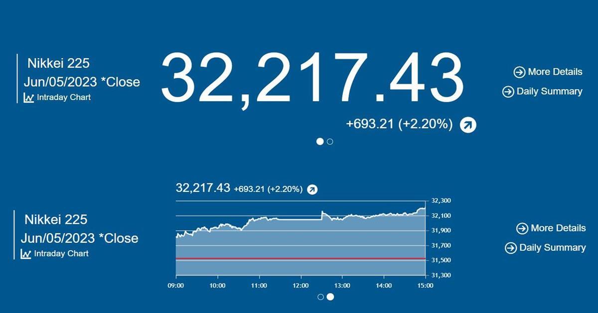 ดัชนีนิกเกอิ 225 ปิดปรับตัวขึ้น 693.21 จุด หรือร้อยละ 2.20 จากเมื่อวันศุกร์ไปปิดที่ 32,217,43 จุด สูงที่สุดนับจากราคาปิดเมื่อวันที่ 20 กรกฎาคม 2533 ซึ่งเป็นช่วงที่ญี่ปุ่นกำลังเกิดภาวะฟองสบู่สินทรัพย์ ส่วนดัชนีโทปิกซ์ปิดปรับตัวขึ้น 37.09 จุด หรือร้อยละ 1.70 ไปปิดที่ 2,219.79 จุด สูงที่สุดนับจากราคาปิดเมื่อวันที่ 1 สิงหาคม 2533