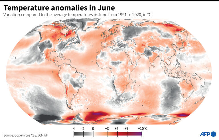 หน่วยบริการสังเกตการณ์โลก “โคเปอร์นิคัส” (Copernicus) ของสหภาพยุโรป กล่าวในแถลงการณ์ว่า เดือนมิถุนายนที่ผ่านมา ถือเป็นเดือนมิถุนายนที่มีอากาศร้อนที่สุดทั่วโลก โดยมีอุณหภูมิสูงกว่าระดับเฉลี่ยระหว่างปี 1991-2020 ที่ 0.5 องศาเซลเซียส ทำลายสถิติสูงสุดที่บันทึกไว้ในเดือนมิถุนายนปี 2019 โคเปอร์นิคัส กล่าวว่า อุณหภูมิเดือนมิถุนายนสูงทำลายสถิติทั่วตะวันตกเฉียงเหนือของยุโรป ในขณะที่พื้นที่บางส่วนของแคนาดา สหรัฐ เม็กซิโก เอเชียและตะวันออกของออสเตรเลีย มีอุณหภูมิสูงกว่าปกติ
