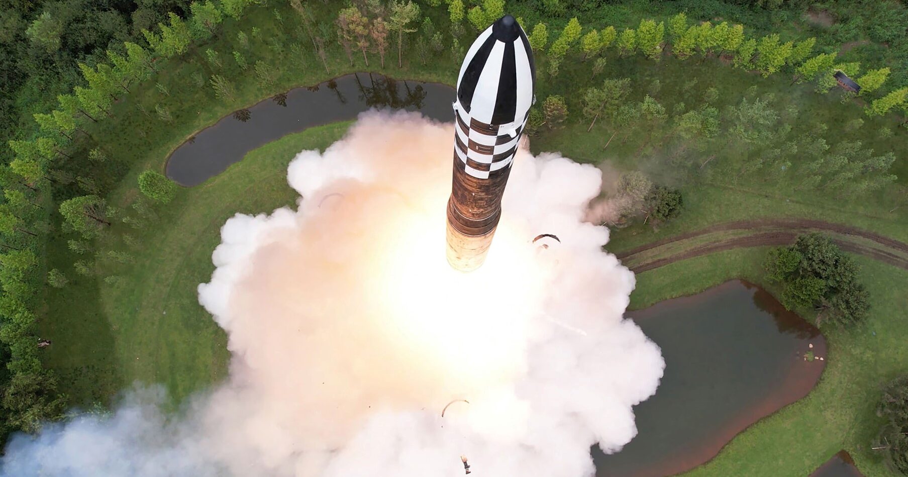 สำนักข่าวกลางเกาหลีหรือเคซีเอ็นเอ (KCNA) ของทางการเกาหลีเหนือเผยแพร่ภาพในวันนี้ เห็นนายคิม ภริยาและกลุ่มคนสนิทปรบมืออย่างตื่นเต้นขณะที่มีการทดสอบยิงขีปนาวุธฮวาซอง-18 (Hwasong-18) ที่ใช้เชื้อเพลิงแข็ง เคซีเอ็นเอรายงานว่า เกาหลีเหนือเคยทดสอบไอซีบีเอ็มแบบนี้มาแล้วในเดือนเมษายน ครั้งนั้นร่อนไปเป็นระยะทาง 1,001 กิโลเมตรที่ระดับความสูงสูงสุด 6,648 กิโลเมตร ก่อนตกในทะเลตะวันออก (เป็นชื่อที่เกาหลีเหนือและเกาหลีใต้ใช้เรียกชื่อทะเลญี่ปุ่น) ส่วนการทดสอบครั้งล่าสุดนี้เป็นการระเบิดอย่างยิ่งใหญ่ที่ทำให้ทั้งโลกสั่นสะเทือน พร้อมกับเผยแพร่ภาพคลิปภาพขีปนาวุธทะยานขึ้นสู่อากาศ