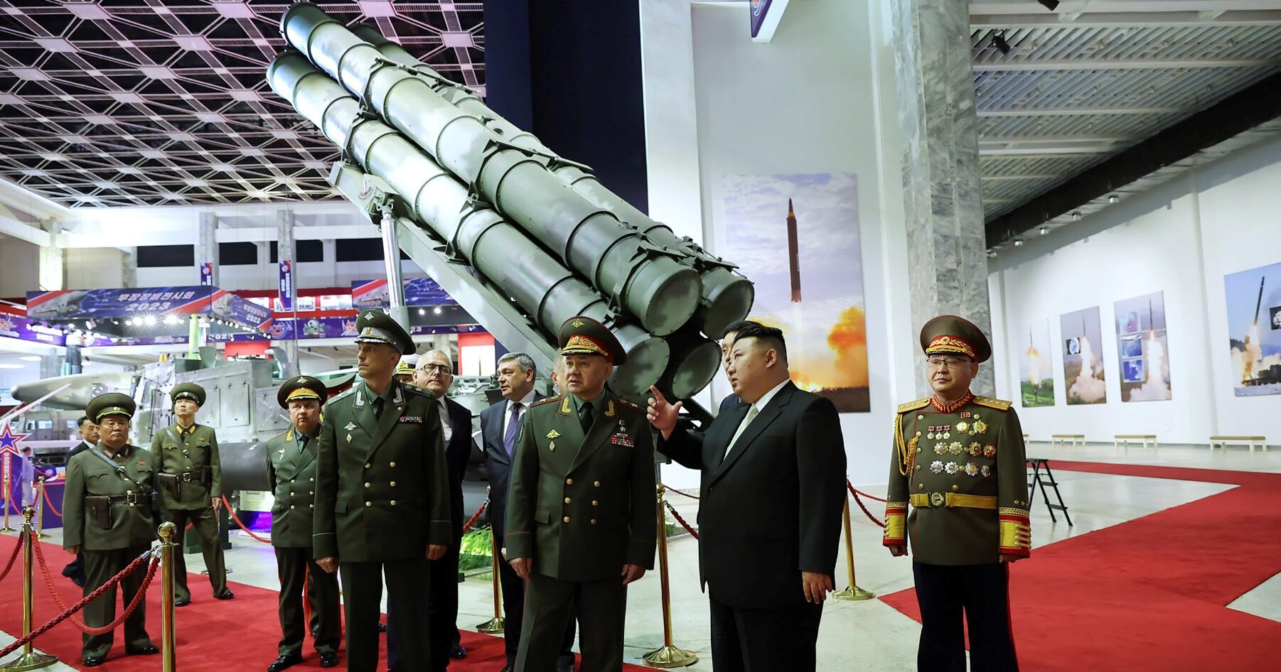 เปียงยาง 27 ก.ค.- นายคิม จอง-อึน ผู้นำเกาหลีเหนือพานายเซอร์เก ชอยกู รัฐมนตรีกลาโหมรัสเซียชมอาวุธรุ่นใหม่ เช่น ขีปนาวุธทิ้งตัวข้ามทวีปหรือไอซีบีเอ็ม (ICBM) โดรนทางทหารที่ไม่เคยเห็นมาก่อน
