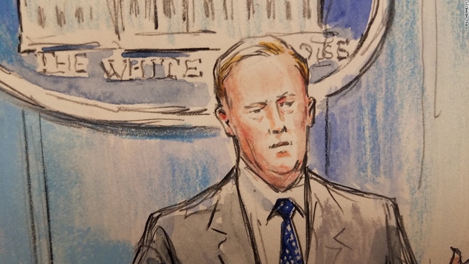 ซีเอ็นเอ็นให้บิล เฮนเนสซี นักสเก็ตช์ภาพที่ปกติทำงานตามห้องพิจารณาคดีความไปสเก็ตช์ภาพการแถลงข่าวที่ห้องปีกตะวันตก-องทำเนียบขาว และบันทึกแต่เสียงของนายฌอน สไปเซอร์ โฆษกทำเนียบขาวขณะคุยกับผู้สื่อข่าว ซีเอ็นเอ็นนำภาพสเกตช์ดังกล่าวมาออกอากาศในรายการข่าวภาคบ่าย พร้อมกับย้ำตลอดรายการว่าทำเนียบขาวไม่อนุญาตให้บันทึกภาพการแถลงข่าว