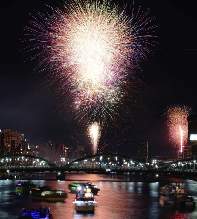 โตเกียว 30 ก.ค. – เทศกาลดอกไม้ไฟที่มีชื่อเสียงมากที่สุดงานหนึ่งของกรุงโตเกียวกลับมาจัดอีกเป็นครั้งแรกในรอบ 4 ปีเมื่อวานนี้ หลังจากมาตรการคุมเข้มป้องกันการระบาดของโควิด-19 ถูกยกเลิกไปแล้ว ทำให้ท้องฟ้าเหนือแม่น้ำซูมิดะ สว่างไสวสวยงามด้วยการแสดงพลุและดอกไม้ไฟ 20,000 ลูก