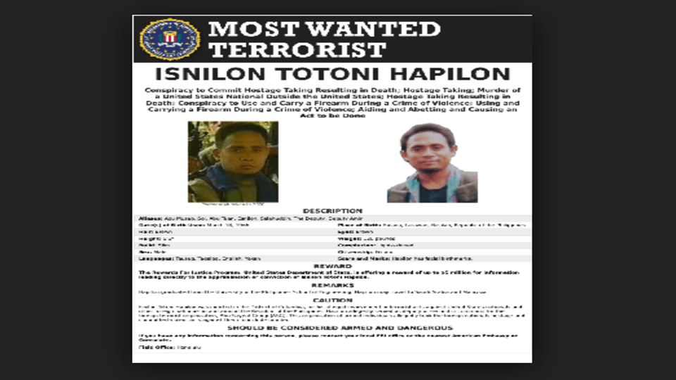 นายฮาปิลอนถูกทางการสหรัฐตั้งข้อหาพัวพันเหตุลักพาตัวชาวอเมริกัน 3 คนในฟิลิปปินส์เมื่อปี 2544 และได้ตั้งค่าหัวเขา 5 ล้านดอลลาร์สหรัฐ (ราว 170 ล้านบาท) เป็นบุคคลที่สหรัฐต้องการตัวมากที่สุดในรายชื่อผู้ก่อการร้ายทั้งหมด เขาเป็นหัวหน้ากลุ่มย่อยของกลุ่มอาบูไซยาฟที่ประกาศสวามิภักดิ์ต่อไอเอส.-สำนักข่าวไทย