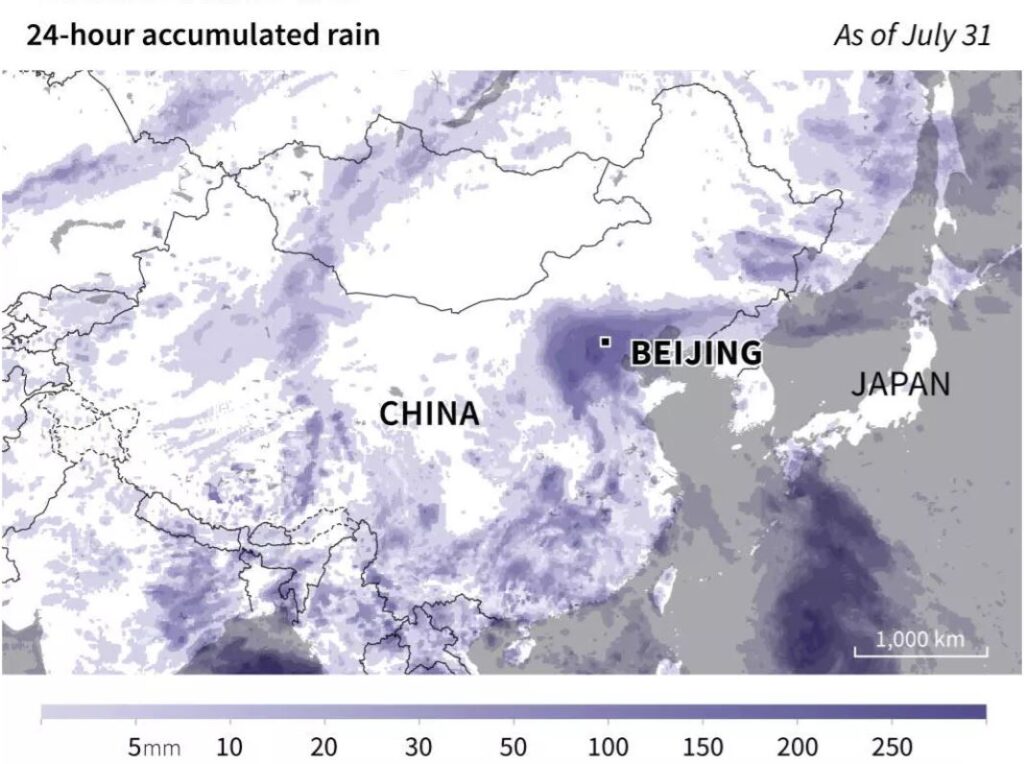 พายุทกซูรี (Doksuri) พัดขึ้นเหนือของจีนตั้งแต่วันศุกร์ โดยได้เคลื่อนตัวขึ้นมาจากมณฑลฝูเจี้ยนที่อยู่ทางใต้ สำนักข่าวซินหัวของทางการจีนรายงานว่า บริการรถโดยสารสาธารณะในกรุงปักกิ่งถูกระงับ ทางการแจ้งเตือนภัยน้ำท่วมระดับสูงสุดกับแม่น้ำต้าฉีเหอที่อยู่ชานเมือง ผู้อาศัยในเขตเฟิงไท่เผยคลิปภาพรถตู้ถูกกระแสน้ำสีโคลนไหลแรงท่วมครึ่งคันรถในเช้าวันนี้ เนื่องจากฝนยังคงตกหนัก ผู้อาศัยอีกคนเผยว่า ทันทีที่ฝนเริ่มตก ถนนก็แปรสภาพเป็นท่อระบายน้ำ และมีน้ำไหลเข้าท่วมชั้นล่างของบ้าน ซึ่งส่วนใหญ่เป็นบ้านเก่า เสี่ยงไม่ปลอดภัย นอกจากนี้ยังมีคลิปน้ำฝนไหลเข้าไปท่วมชานชาลารถไฟใต้ดินย่านมหาวิทยาลัยที่อยู่ทางฝั่งตะวันตกของกรุงปักกิ่ง หนังสือพิมพ์พีเพิลเดลีของทางการจีนรายงานว่า เจ้าหน้าที่ฉุกเฉินพบศพจมน้ำ 2 ศพ ขณะลาดตระเวนในเช้าวันนี้