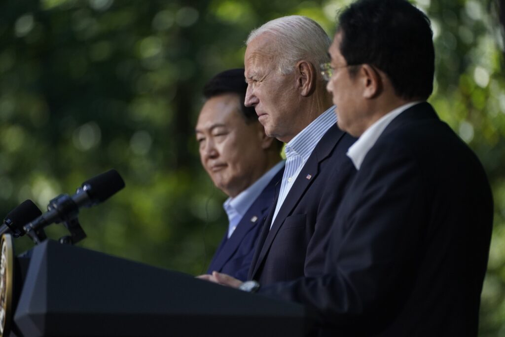 ในระหว่างการประชุมสุดยอดร่วมกับผู้นำเกาหลีใต้และญี่ปุ่นที่แคมป์เดวิด บ้านพักตากอากาศประจำตำแหน่งของประธานาธิบดีสหรัฐใกล้กรุงวอชิงตัน นายไบเดน ได้กล่าวชื่นชมความกล้าหาญทางการเมืองของประธานาธิบดียุน ซอก-ยอล ของเกาหลีใต้และนายกรัฐมนตรีฟูมิโอะ คิชิดะ ของญี่ปุ่นในการพลิกหน้าประวัติศาสตร์ของความสัมพันธ์ที่เป็นประปักษ์กันในอดีต นายไบเดนกล่าวว่า การประชุมสุดยอด 3 ฝ่ายครั้งนี้ไม่ได้มีเป้าหมายเกี่ยวกับจีน แต่ในแถลงการณ์ร่วมผู้นำทั้งสามกล่าวว่า ไม่เห็นดด้วยกับพฤติกรรมที่เป็นตรายและก้าวร้าวของจีน ในข้อพิพาทเรื่องดินแดนทางทะเลในทะเลตะวันออกและทะเลจีนใต้
