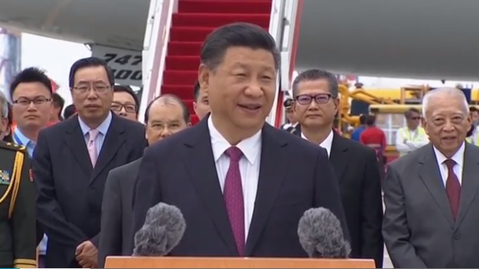 เครื่องบินแอร์ไชนานำประธานาธิบดีสีและภริยามาถึงท่าอากาศยานเช็กแล็บก๊อกของฮ่องกงวันนี้ ผู้นำจีนกล่าวทันทีที่ลงจากเครื่องบิน ขอบคุณผู้มารอต้อนรับแม้อากาศร้อน ครั้งนี้เป็นครั้งแรกในรอบ 9 ปีที่เขาได้กลับมายังฮ่องกงอีกครั้ง เขามีความสุขมากเพราะฮ่องกงอยู่ในใจเขาเสมอ ทางการจีนพร้อมร่วมมือกับทุกภาคส่วนในสังคมฮ่องกงทบทวนสิ่งที่เกิดขึ้นตลอด 20 ปีที่ผ่านมาเพื่อสรุปบทเรียนและมองไปสู่อนาคต และพร้อมร่วมกันสร้างหลักประกันว่าหนึ่งประเทศสองระบบจะมั่นคงและมีอนาคตที่ยาวไกล อย่างไรก็ดี ประธานาธิบดีสีไม่ตอบคำถามผู้สื่อข่าว รวมถึงผู้ที่ถามเรื่องจีนจะอนุญาตให้นายหลิว เสี่ยวโป ผู้มีความเห็นไม่ลงรอยกับรัฐบาลไปรักษาตัวมะเร็งระยะสุดท้ายในต่างประเทศหรือไม่