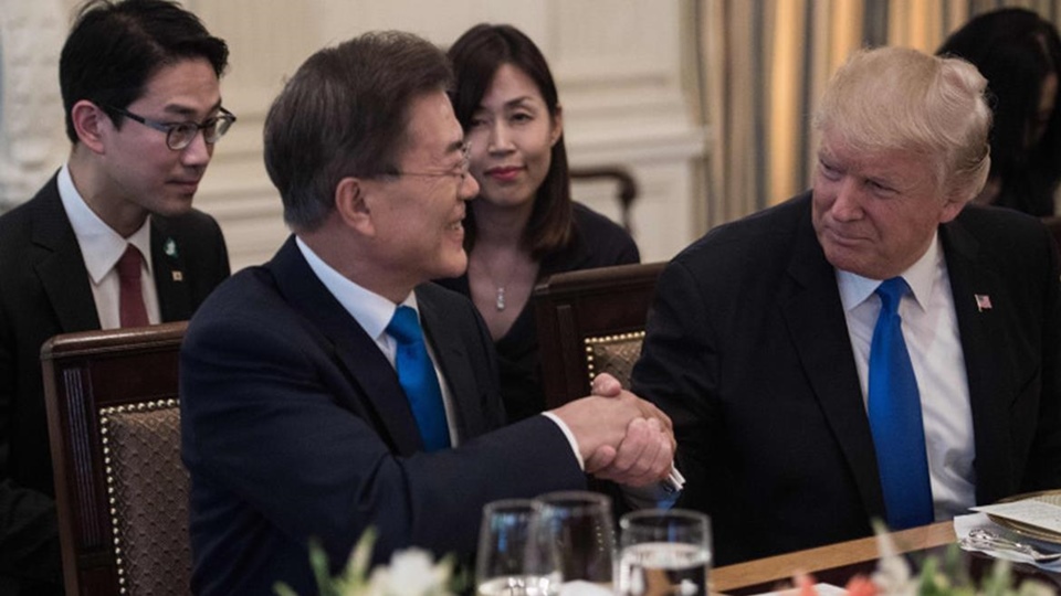 ประธานาธิบดีทรัมป์ พร้อมด้วยนางเมลาเนีย ทรัมป์ สตรีหมายเลขหนึ่งของสหรัฐ เปิดทำเนียบขาวต้อนรับการมาเยือนของผู้นำเกาหลีใต้และคณะ พร้อมจัดเลี้ยงอาหารค่ำอย่างเป็นทางการวานนี้ นายทรัมป์กล่าวว่า เขาทราบว่าประธานาธิบดีมุนได้มีการนำเรื่องความซับซ้อนเกี่ยวกับปัญหาในเกาหลีเหนือขึ้นมาพูดคุยกับคนอื่นๆ ไปบ้างแล้ว แต่เขาจะหารือกับประธานาธิบดีมุนด้วยตนเองโดยละเอียดอีกครั้ง