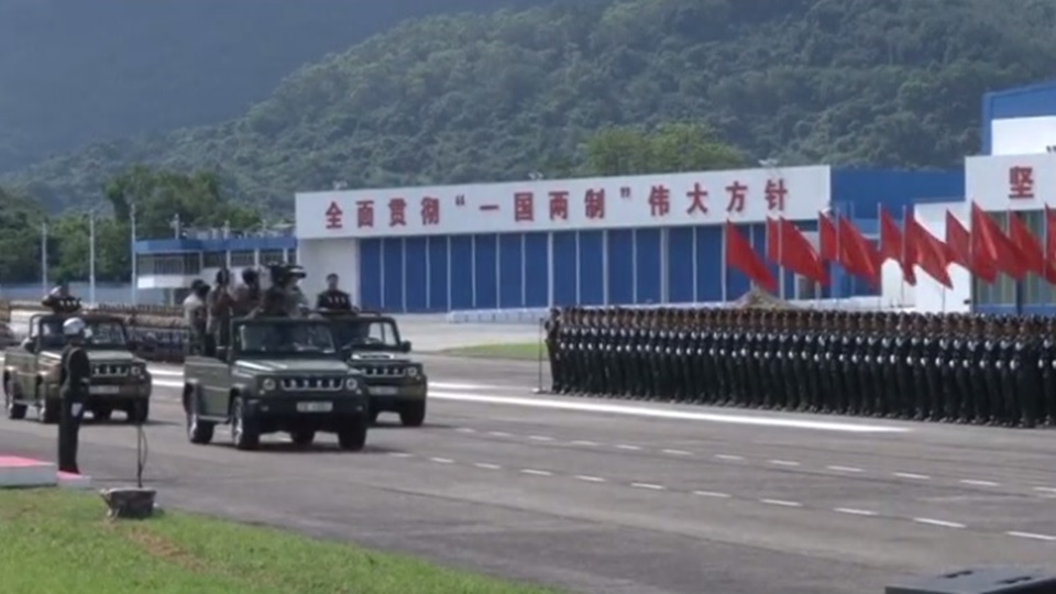 บรรยากาศภายในงาน มีการสั่งให้เฮลิคอปเตอร์บินวนอยู่เหนือหัวในบริเวณฐานทัพ ส่วนประธานาธิบดีสี จิ้นผิง ปรากฎตัวในขบวนรถตรวจกองทหารรักษาการณ์และอาวุธยุทโธปกรณ์กว่า 100 ชิ้นที่จัดแสดงในพิธีสวนสนาม.- สำนักข่าวไทย