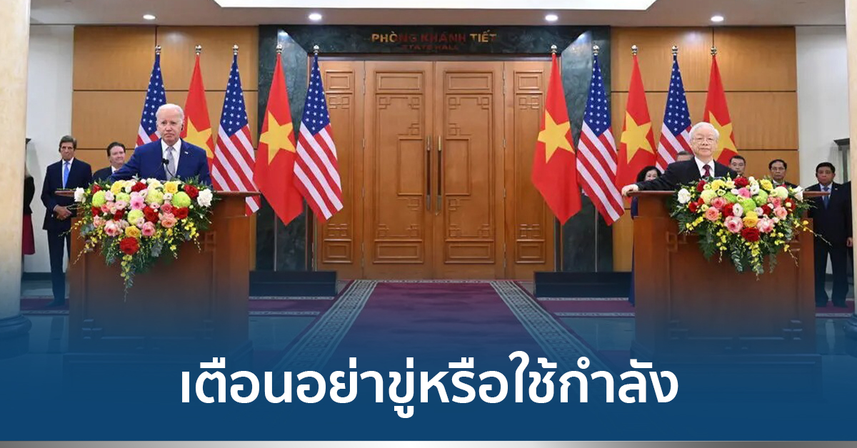 ประธานาธิบดีโจ ไบเดนของสหรัฐและนายเหวียน ฝู จ่อง เลขาธิการพรรคคอมมิวนิสต์เวียดนามระบุในแถลงการณ์ร่วมวันนี้ว่า การอ้างกรรมสิทธิ์ทับซ้อนกันในทะเลจีนใต้ ซึ่งเป็นเส้นทางเดินเรือเชิงยุทธศาสตร์จะต้องได้รับการแก้ไขตามบรรทัดฐานสากล สหรัฐและเวียดนามสนับสนุนอย่างแข็งขันให้แก้ไขข้อพิพาทด้วยทางออกสันติภายใต้กรอบกฎหมายสากล โดยไม่มีการข่มขู่หรือการใช้กำลัง พร้อมกับเรียกร้องเรื่องเสรีภาพในการเดินเรือและบินผ่าน และเรื่องการค้าขายอย่างถูกกฎหมายโดยไม่ถูกขัดขวางในทะเลจีนใต้