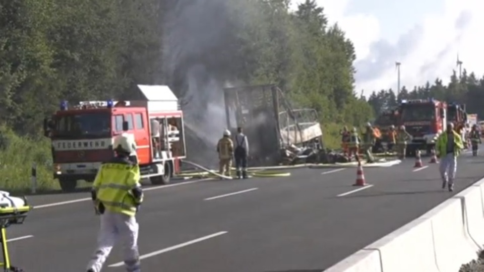 มิวนิก 3 ก.ค. – ตำรวจเยอรมนีกล่าวคาดว่า อาจมีผู้เสียชีวิตถึง 17 คนจากอุบัติเหตุรถทัวร์ระเบิดไฟลุกท่วมภายหลังชนเข้ากับรถบรรทุกพ่วงทางภาคใต้ของเยอรมนีวันนี้