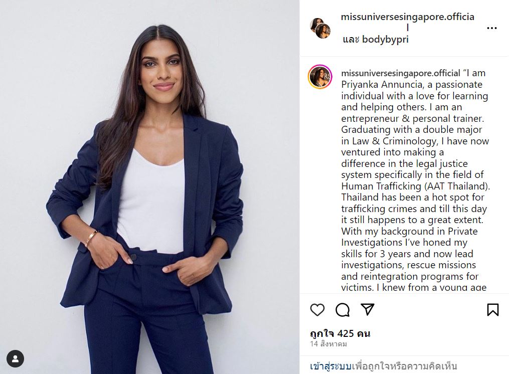 สิงคโปร์ 19 ก.ย.- ปรียังกา แอนนันเซีย มิสยูนิเวิร์สคนใหม่ของสิงคโปร์เคยโพสต์ว่า จะต่อสู้กับการค้ามนุษย์ในประเทศไทย