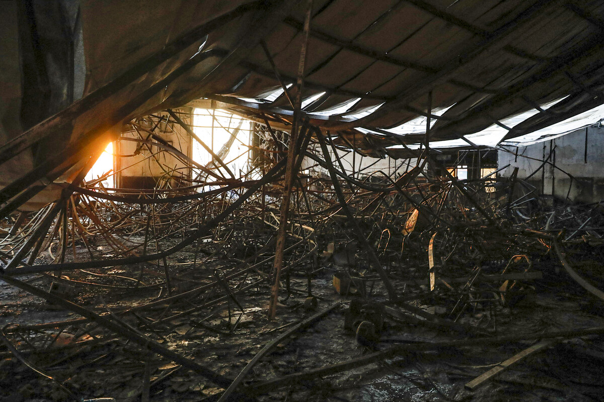 ผู้ร่วมพิธีซึ่งอยู่ในอาการเศร้าโศกร่วมงานภายในโบสถ์อัล-ทาเฮราแห่งคริสตจักรคาทอลิกซีเรียที่มีการวางภาพผู้เสียชีวิตเรียงรายตามขั้นบันได สตรีวัย 55 ปีที่สูญเสียญาติหลายคนในเหตุไฟไหม้งานแต่งงานที่เกิดขึ้นเมื่อวันอังคารกล่าวว่า ทั้งโกรธและเสียใจจนไม่สามารถบรรยายและหาสิ่งใดเปรียบได้
