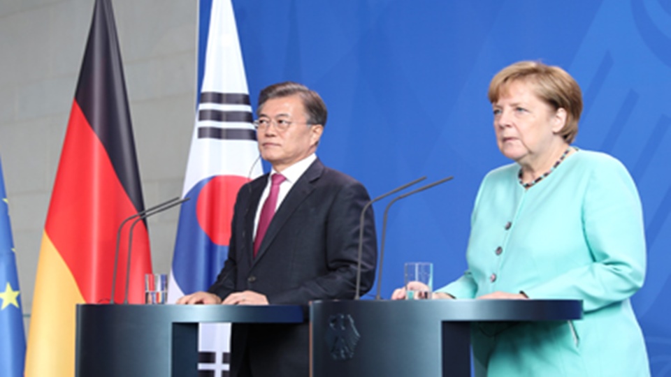 นายมุนกล่าวระหว่างการพบปะกับนายกรัฐมนตรีอังเกลา แมร์เคิล ของเยอรมนีในกรุงเบอร์ลินว่า ประชาคมโลกควรช่วยกันเพิ่มแรงกดดันเกาหลีเหนือให้ยอมเจรจาปลดอาวุธนิวเคลียร์ เพราะสิ่งที่น่ากังวลในขณะนี้คือ โครงการพัฒนาอาวุธนิวเคลียร์และขีปนาวุธของเกาหลีเหนือพัฒนาไปเร็วกว่าที่คาดไว้มาก ล่าสุดเกาหลีเหนืออ้างว่า เพิ่งประสบความสำเร็จในการทดสอบยิงขีปนาวุธความทวีปเป็นครั้งแรกเมื่อวันอังคารที่ผ่านมา โดยขีปนาวุธถูกยิงขึ้นไปสูงถึง 2,800 กิโลเมตร ก่อนที่จะตกลงสู่ทะเลตะวันออก หรือทะเลญี่ปุ่น ห่างจากฐานยิงราว 930 กิโลเมตร