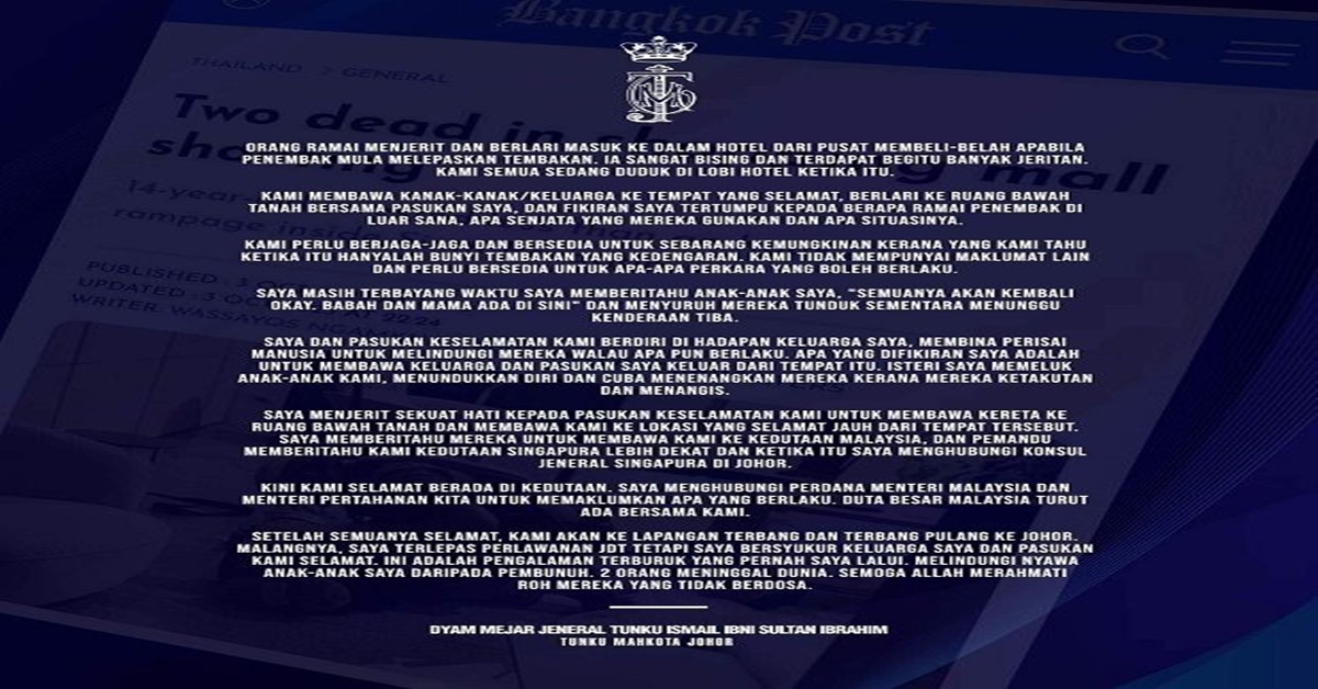 ยะโฮร์ บารู 4 ต.ค.- มกุฎราชกุมารรัฐยะโฮร์ของมาเลเซียเล่าประสบการณ์เหตุกราดยิงในห้างสรรพสินค้าใจกลางกรุงเทพฯ ของไทยผ่านสื่อสังคมออนไลน์