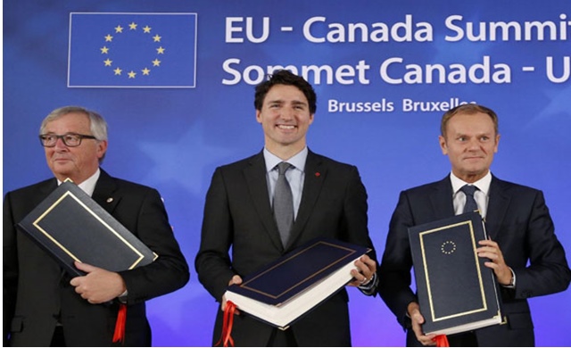 นายกรัฐมนตรีจัสติน ทรูโดของแคนาดา นายโดนัลด์ ทัสค์ ประธานคณะมนตรียุโรป และนายฌอง-โคล้ด ยุงเกอร์ ประธานคณะกรรมาธิการยุโรป และนายกรัฐมนตรีโรเบิร์ต ฟิโก แห่งสโลวาเกียซึ่งเป็นประธานหมุนเวียนอียู ได้ร่วมลงนามในความตกลงทางการค้าและการลงทุน หรือ CETA ในขณะที่มีกลุ่มผู้ประท้วงชุมนุมด้านนอกสำนักงานใหญ่อียูในกรุงบรัสเซลส์ของเบลเยียม นายกรัฐมนตรีทรูโดแถลงต่อผู้สื่อข่าวภายหลังเสร็จสิ้นพิธีลงนามว่า ข้อตกลงดังกล่าวเป็นผลมาจากการเจรจามานานหลายปีและเป็นหุ้นส่วนที่มีผลประโยชน์ร่วมกัน สำหรับประเทศสมาชิกอียูต้องได้รับเสียงเป็นเอกฉันท์ในหมู่สมาชิกทั้งหมด 28 ประเทศ และเบลเยียมจำเป็นต้องได้รับเสียงสนับสนุนจากเขตการปกครองท้องถิ่นทั้งหมดในการร่วมลงนามข้อตกลง CETA เช่นกัน นายกรัฐมนตรีแคนาดามีกำหนดมาร่วมพิธีลงนามเมื่อวันพฤหัสบดีที่แล้ว แต่ต้องยกเลิก เมื่อเขตวาลโลเนียในเบลเยียมไม่เห็นด้วยกับรัฐบาล เพราะนักการเมืองท้องถิ่นโต้ว่าจะกระทบการจ้างงาน สิ่งแวดล้อม มาตรฐานการบริโภค และการแข่งขันจากบริษัทต่างชาติที่มีต่อธุรกิจท้องถิ่น .- สำนักข่าวไทย