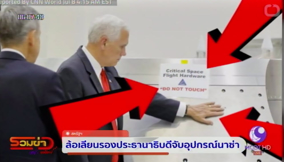 สหรัฐ 9 ก.ค.-นายไมค์ เพนซ์ รองประธานาธิบดีสหรัฐ ถูกผู้ใช้สื่อสังคมออนไลน์จำนวนมากล้อเลียน หลังภาพที่เขายื่นมือออกไปจับอุปกรณ์ชิ้นสำคัญของนาซา ที่มีเครื่องหมายห้ามจับติดอยู่ ถูกเผยแพร่ออกไปอย่างรวดเร็ว