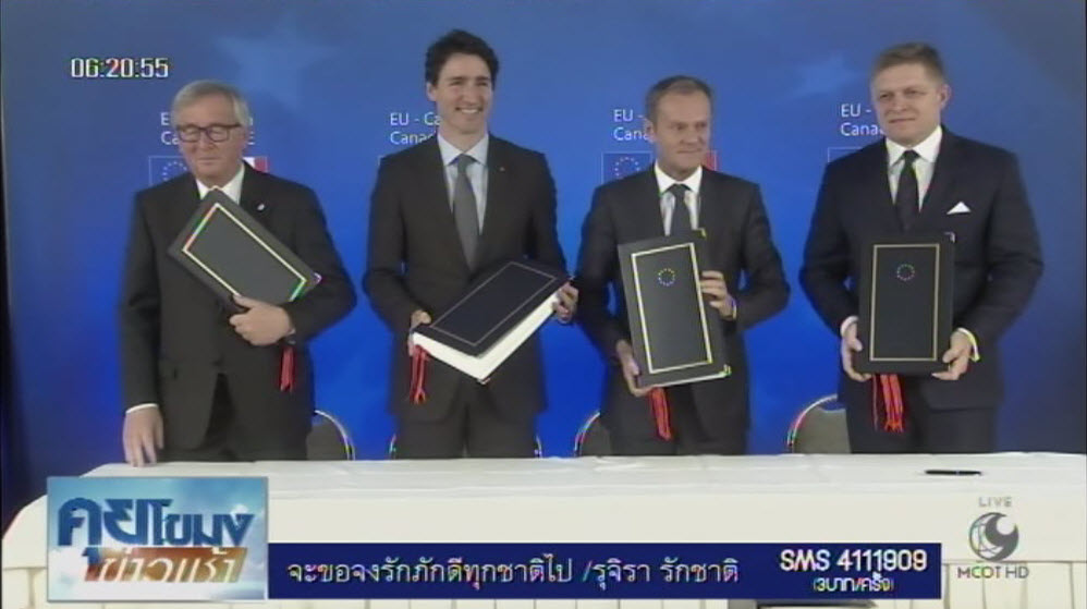 พิธีลงนามข้อตกลงการค้าระหว่างแคนาดาและอียูมีขึ้นหลังจากได้รับความเห็นชอบจากชาติสมาชิกอียูทั้ง 28 ประเทศ เมื่อวันศุกร์ที่ผ่านมา เดิมกำหนดลงนามตั้งแต่วันพฤหัสบดีที่แล้ว แต่ต้องล่าช้าออกไป เนื่องจากภูมิภาควัลโลเนียของเบลเยียมซึ่งใช้ภาษาฝรั่งเศส และมีประชากร 3.6 ล้านคน ไม่เห็นด้วยกับเงื่อนไขในข้อตกลงดังกล่าว ส่งผลให้รัฐบาลเบลเยียมต้องจัดการความขัดแย้งทางการเมืองในประเทศก่อนจะลงนามในบ่ายวันศุกร์. – สำนักข่าวไทย
